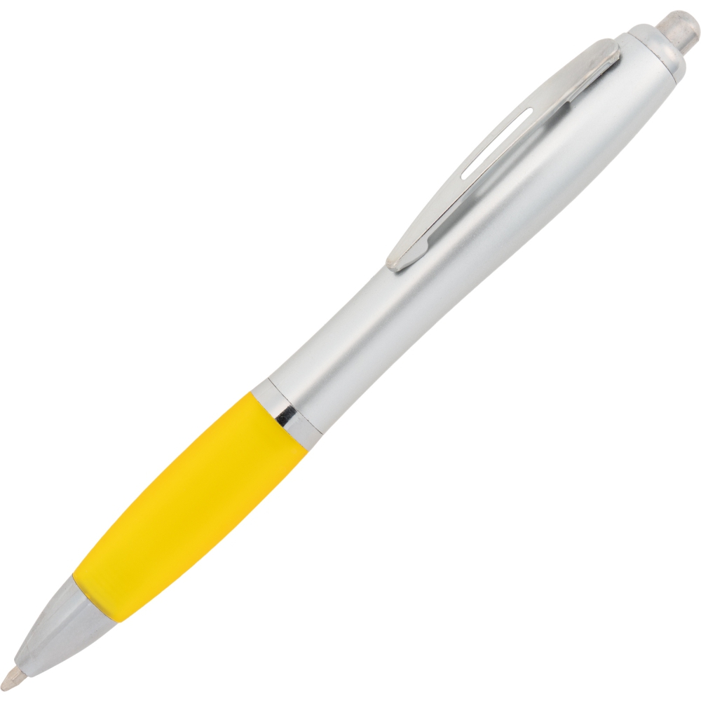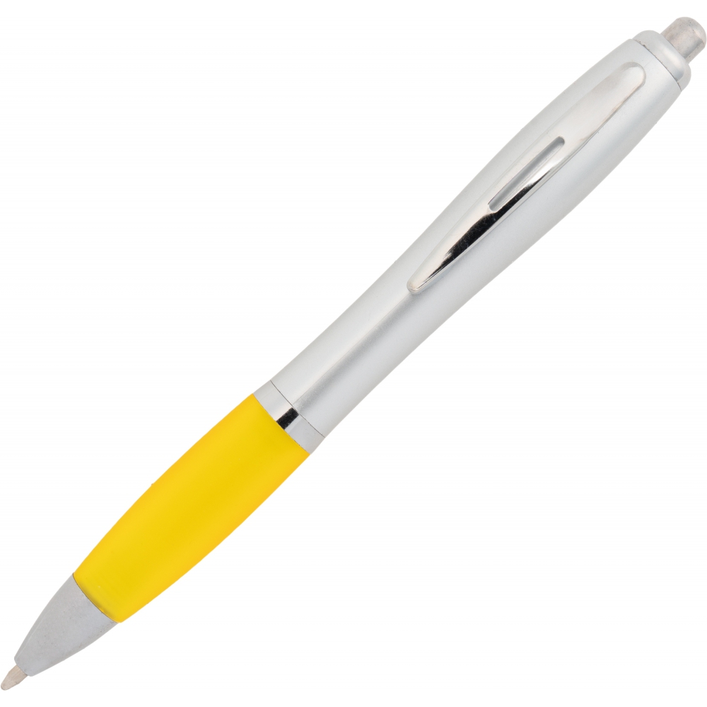 Plastikowy długopis z satynowym połyskiem, metalowym klipsem, gumowanym korpusem i dużym niebieskim wkładem.