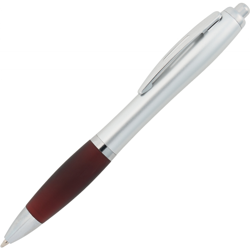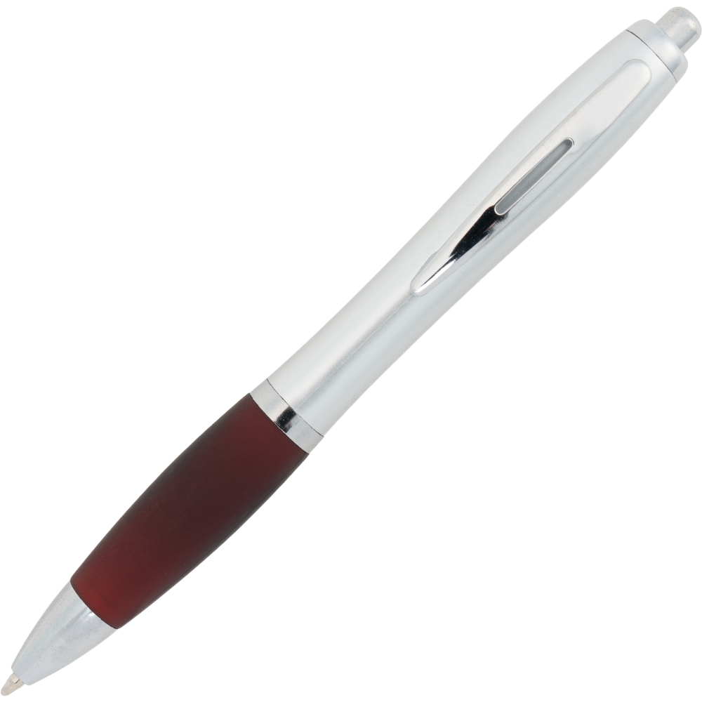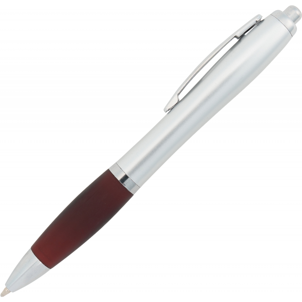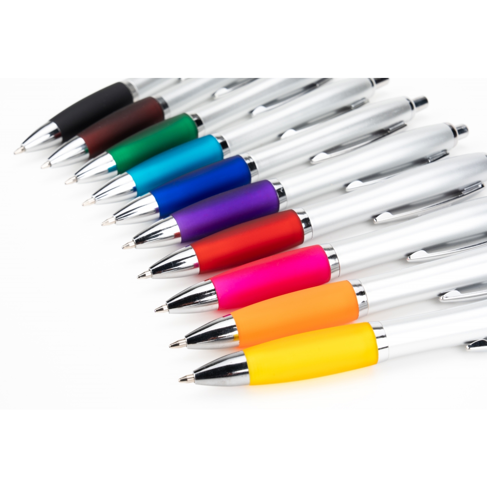 Plastikowy długopis z satynowym połyskiem, metalowym klipsem, gumowanym korpusem i dużym niebieskim wkładem.