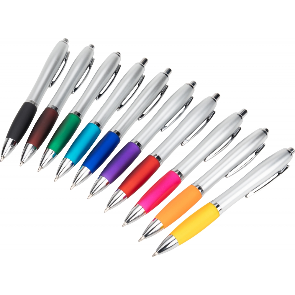 Plastikowy długopis z satynowym połyskiem, metalowym klipsem, gumowanym korpusem i dużym niebieskim wkładem.